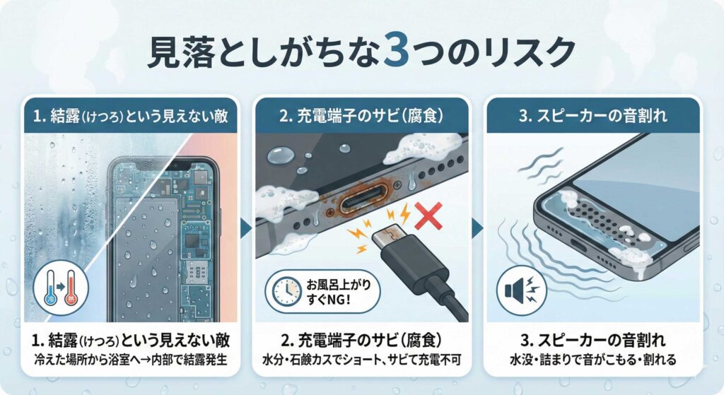 冷えた脱衣所から、熱気ムンムンの浴室にスマホを持ち込んだ瞬間、内部の基盤に結露が発生。