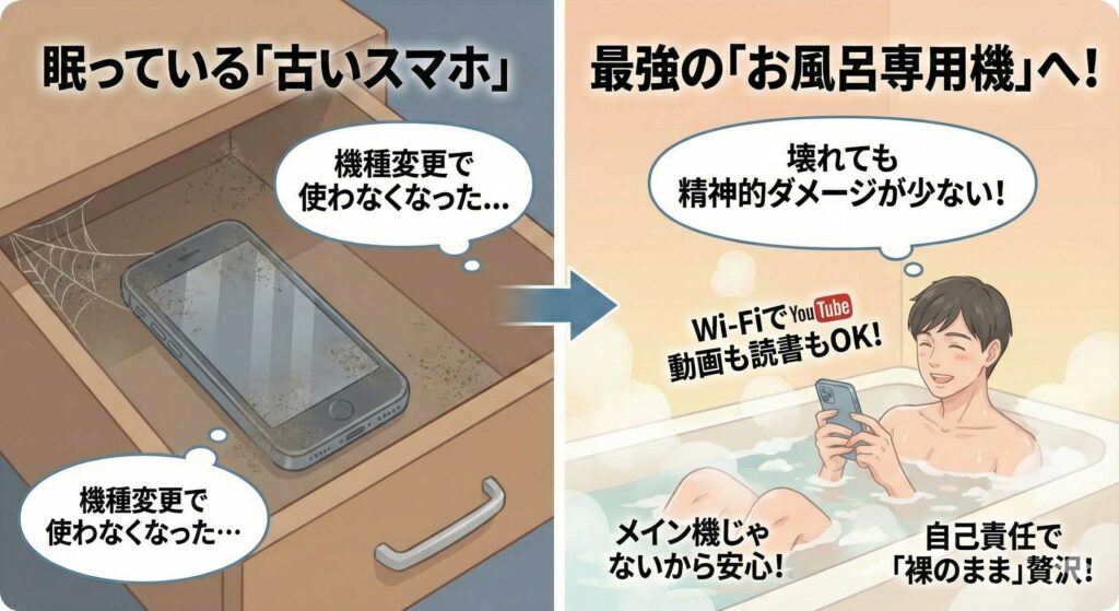 もし、手元に機種変更して使わなくなった「古いスマホ」が眠っているなら、それを「お風呂専用機」にしてしまうのが、実は最強の解決策です。