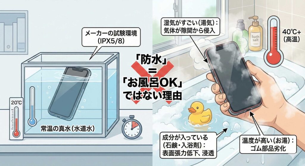 お風呂という環境は、メーカーの想定する「テスト環境」とはこれだけ違います。