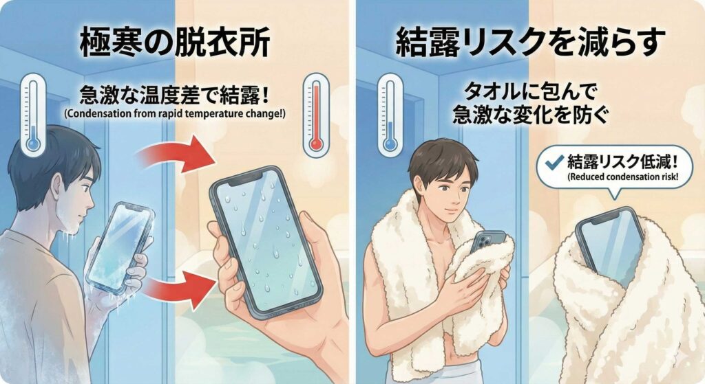 脱衣所が極寒の場合は、タオルに包んで持ち込むなどして、急激な温度変化を与えないように気を使うだけでも、結露リスクは減らせます。