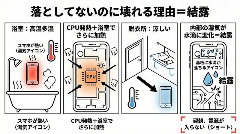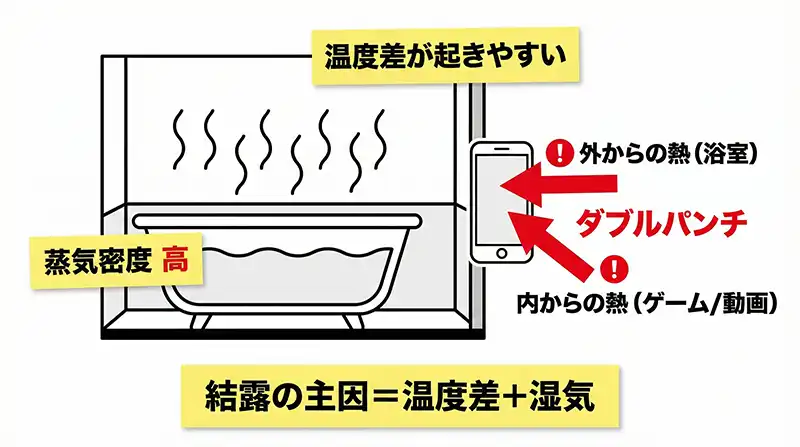 - 浴室はスマホにとって高温多湿+温度差が厳しい環境