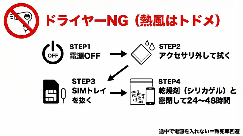 - SIMトレイを抜く(機種によっては乾きやすくなることがある)