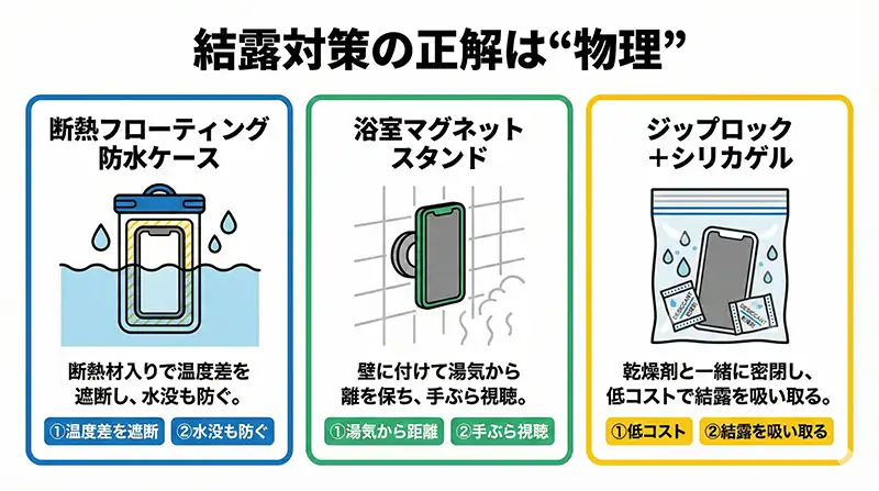 - 対策は精神論ではなく「物理」:①断熱系ケース ②湯気から距離 ③吸湿の補助