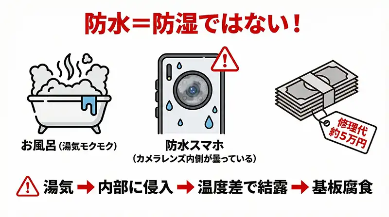 残念ながら、防水でもお風呂の高温多湿・湯気・温度差でリスクが上がります。