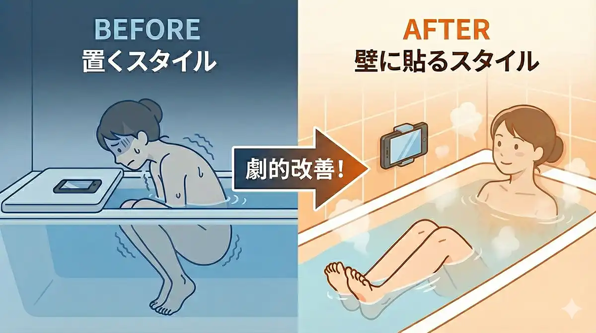 ASVELのマグネットホルダーに変えていちばん良かったのは、「スマホの置き場」が固定されて、浴槽の空間が“自分のもの”として使えるようになったことです。