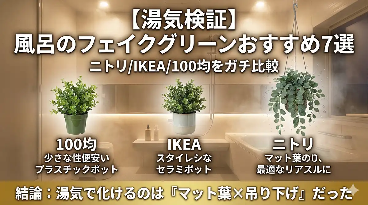 答え:湯気補正込みだと、ニトリ系(マット葉×吊り下げ)>IKEA系(デザイン鉢)>100均(工夫前提)の順でした。